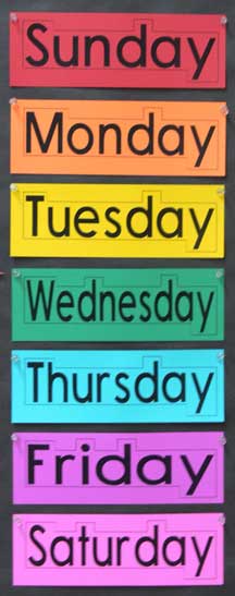 Days of the week: Monday, Tuesday, Wednesday, Thursday, Friday, Saturday, Sunday. Months: January, February, March, April, May, June, July, August, September, October, November, December. Ordinals numbers: first, second, third, fourth, fifth, sixth, seventh, eighth, nineth, tenth, eleventh, twelveth... |